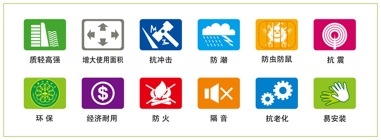 质轻高强、防火、防水、防潮、隔热、保温、耐腐蚀、抗冲击、抗老化、抗震、防虫鼠咬、易加工、易装饰、性能 |
